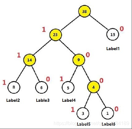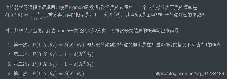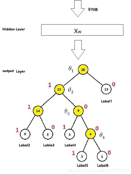 以Label5为例,从根节点到Label5中间经历了4次分支,每次分支都可以认为是进行了一次2分类,根据哈夫曼编码,可以把路径中的每个非叶子节点0认为是负类,1认为是正类(也可以把0认为是正类)