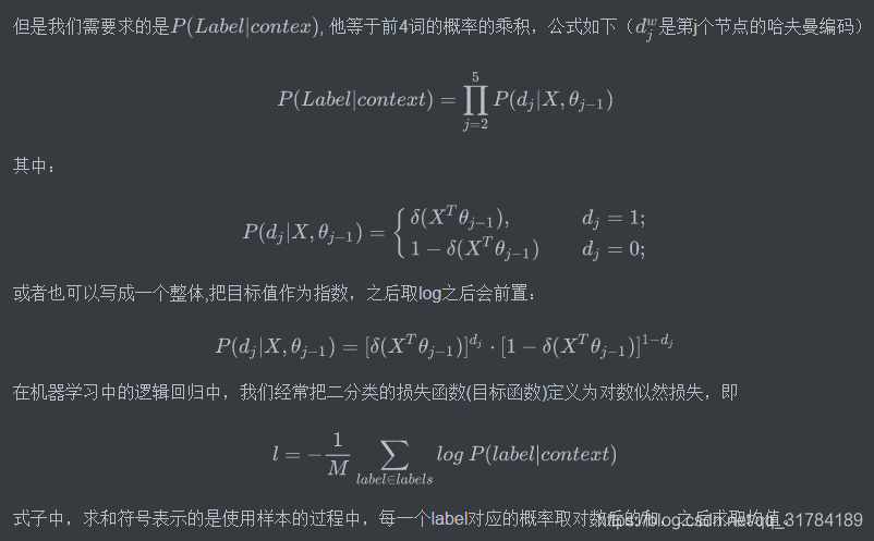 上图中,红色为哈夫曼编码,即label5的哈夫曼编码为1001,那么此时如何定义条件概率呢?