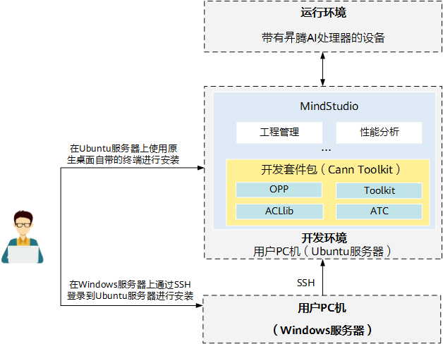 DLAP221开发环境部署1. 概述开发者基于DLAP221进行AI应用开发前,需要在制作SD卡时准备的Ubuntu服务器中部署开发环境,有以下三种场景:独立部署开发套件包,基于后台命令行的方式进行交叉开发。部署MindStudio,基于MindStudio开发工具进行AI应用开发,MindStudio安装时需要同时安装开发套件包(Cann Toolkit)。Cann Toolkit为开发者提供基
