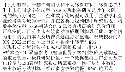 可以用于金融学和企业经济等领域的研究,并在各类顶级刊物中频繁出现,将数字化转型与。质量、科学准确的科研数据,长期以来好评如潮,数据质量有目共睹。究的重要性,我们在论坛此唯一账号,其他类似账号均为假冒,请大家注意甄别,其他渠道。据集来源权威,由本人及所在课题组独家整理、权威校验、独家发布,更新到2022年,100%真实准确,在此承诺观测值100%无错误、无误差,亲测效果极佳,100%不。量,超470