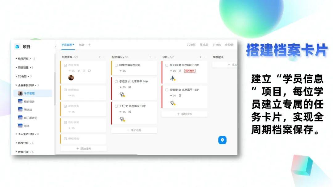 通过这样分模块、设卡片,方便数字化存档所有学员的信息,方便查找、整理,进行数据处理,也方便学校统一管理固定阶段中的所有学员。