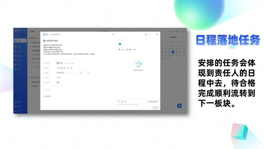 对于相应的责任人来说,安排的任务会体现到每个人的日程中去,不用担心因为手头工作太多而忘记,任务描述还会对工作质量和细节提出要求,待合格完成才会顺利流转到下一板块。