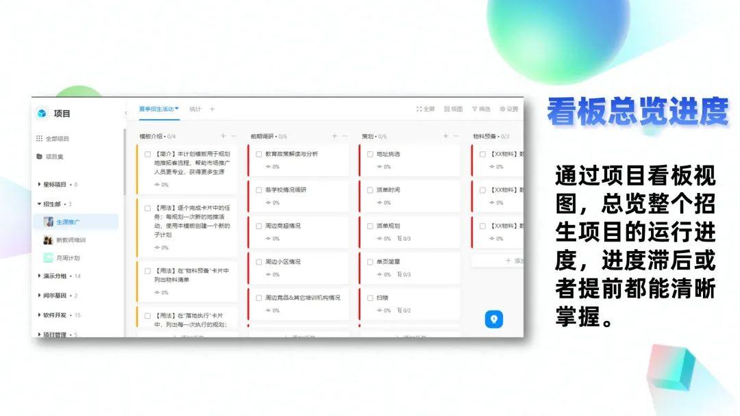 对于招生工作的负责人来说,通过项目看板视图,可以总览整个招生项目的运行进度,进度滞后或者提前都能清晰掌握,对应责任人执行情况反馈不及时、不到位的问题就可以迎刃而解。