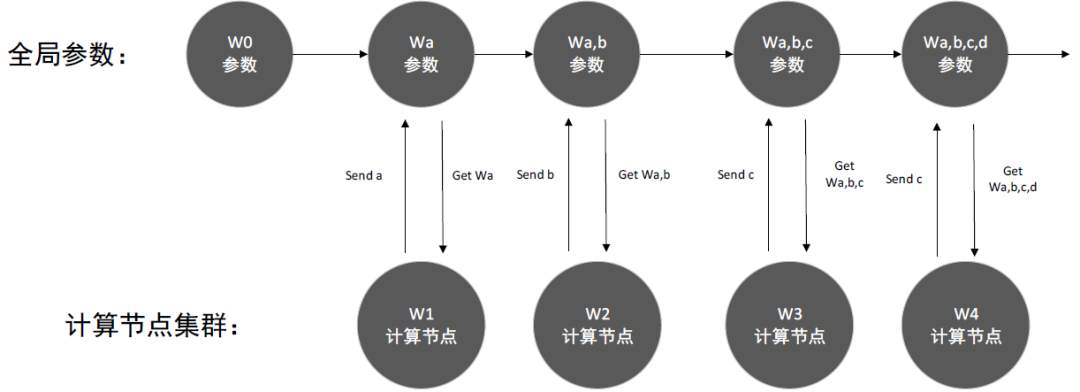 (1)在计算节点上,分别计算梯度值,不直接发送给参数服务器,使用梯度值,计算本地权重参数。