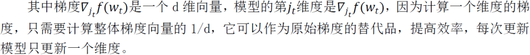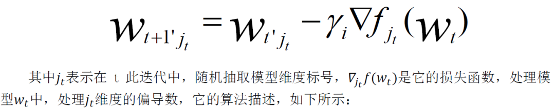 除了随机梯度的方式,也可以使用随机坐标下降,对整体算法进行优化。它的原理是对模型维度进行随机采用,从而优化算法模型的训练,它的更新公式,如下所示:
