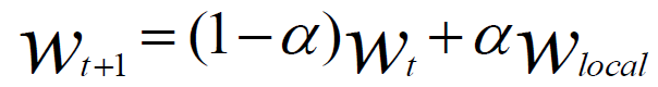 (3)使用Wt表示当前参数服务器的全局参数,Wct表示计算节点传的参数值,Wt+1表示计算后的新全局参数,再引入变量α,表示本地参数在全局权重,最终它的计算公式如下所示: