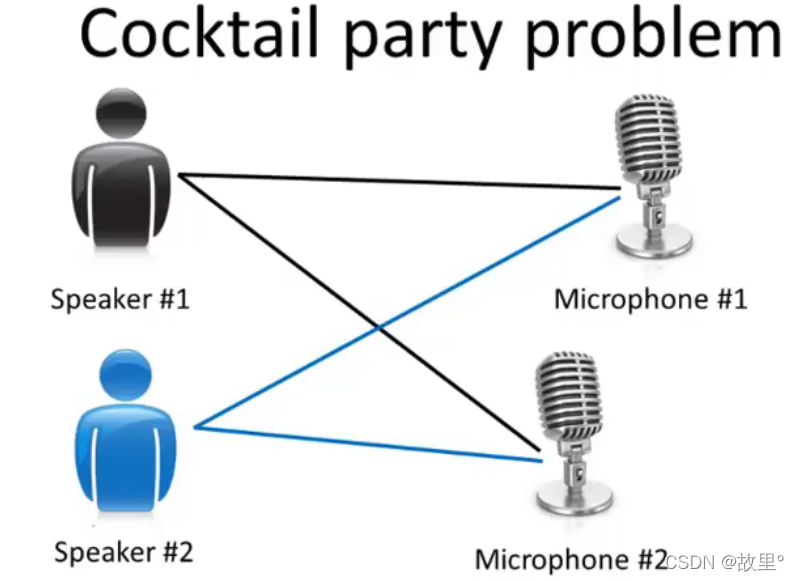 该问题描述的是给定混合信号,如何分离出鸡尾酒会中同时说话的每个人的独立信号。当有N个信号源时,通常假设观察信号也有N个(例如N个麦克风或者录音机)。该假设意味着混合矩阵是个方阵,即J = D,其中D是输入数据的维数,J是系统模型的维数。要分离出鸡尾酒会中同时说话的每个人的独立信号。