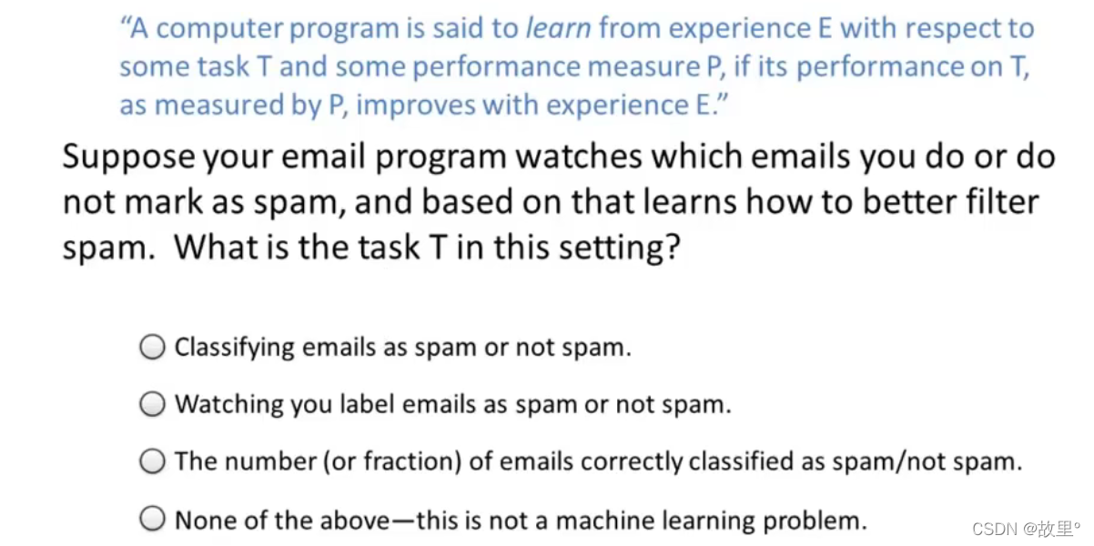 目录一、机器学习概述 - What is machine learning ?:二、机器学习分类 - Machine learning algorithms:1.监督学习 - Supervised learning:2.无监督学习 - Unsupervised learning:Cocktail party problem algorithm:一、机器学习概述 - What is machine