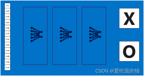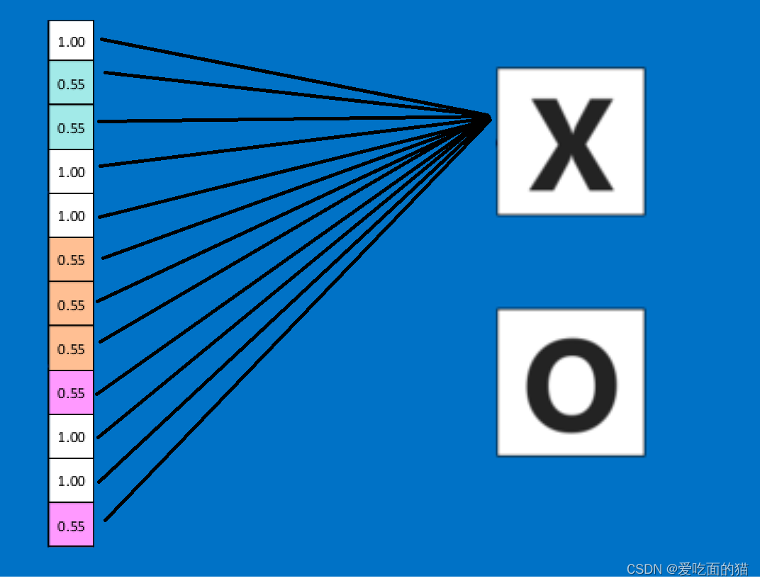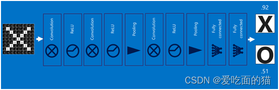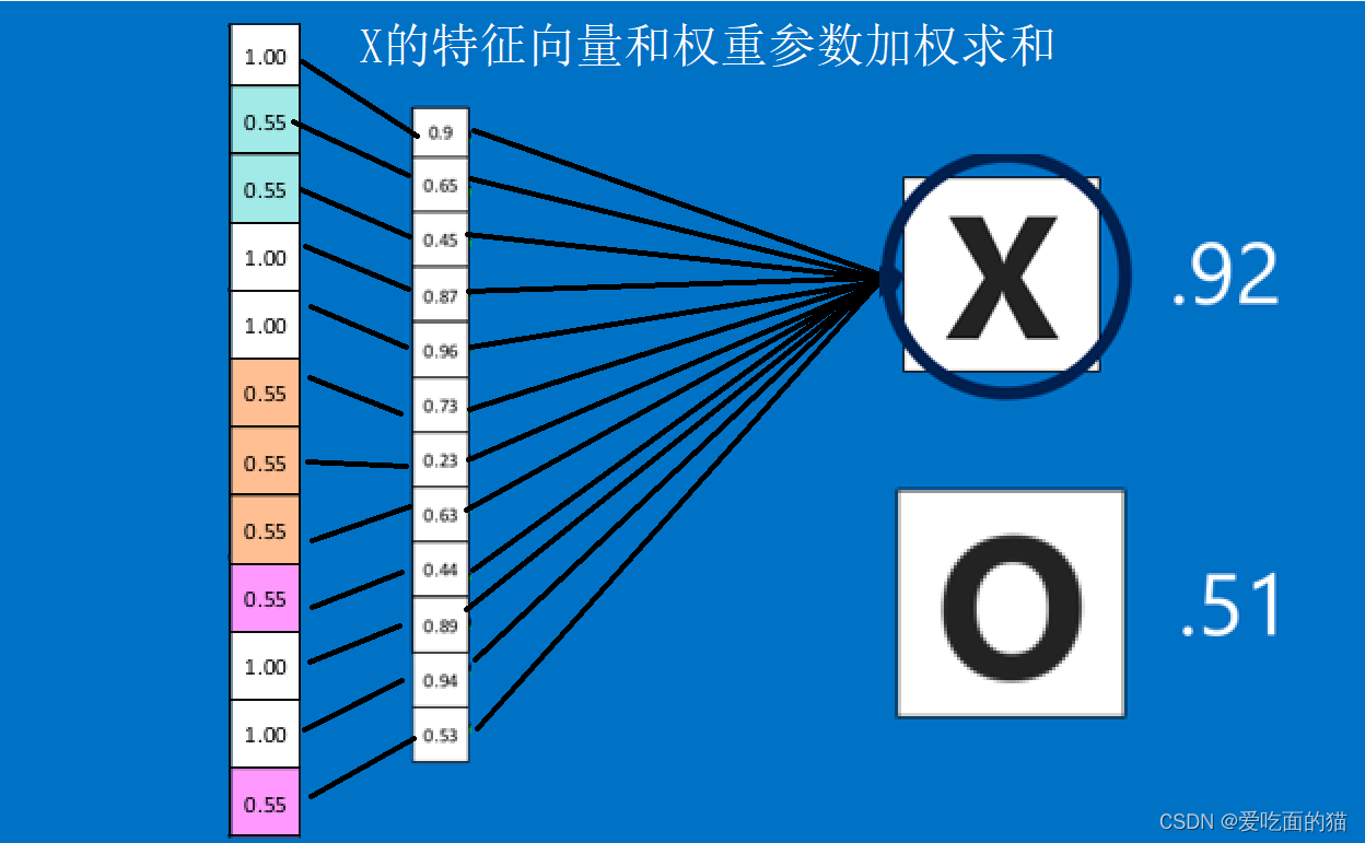 在利用该模型进行结果识别时,根据刚才提到的模型训练得出来的权重,以及经过前面的卷积、激活函数、池化等深度网络计算出来的结果,进行加权求和,得到各个结果的预测值,然后取值最大的作为识别的结果(如下图,最后计算出来字母X的识别值为0.92,字母O的识别值为0.51,则结果判定为X)