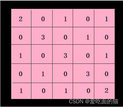 通过卷积核进行卷积运算得到的特征图结果如下,我们进行分析,在原图中,如果右下斜线都是1,而卷积核也是右下斜线是1,那么他们经过卷积运算得到的结果就会比较大,也就是说我们提取到了这些特征。(例如在特征图中的右下斜线中的3表明特征明显,而2则表示特征弱一点,而实际上我们他原图中顶脚是左上和右下都是0,也比较符合。而特征图中0和1表示原图中对应位置没有右下斜线的特征)。