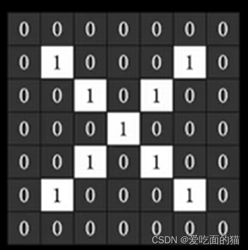 我们看 7x7 的图片,想让计算机判断这个黑白图片是不是X。计算机首先要把图像转换为一堆数字,因为是黑白图片,所以黑色0,白色是1,转为数字如下图: