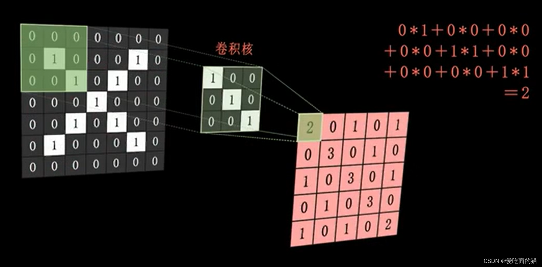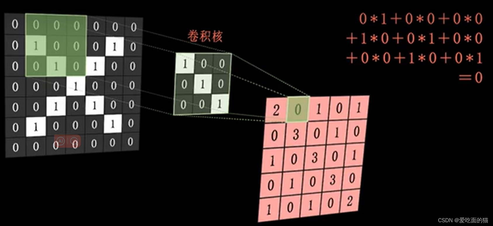 就是把卷积核(矩阵)放到图片对应的位置进行对应位置数据相乘再求和,然后放到被卷积核覆盖区域的中间的位置。卷积核向右平移1个单元,再次执行相同操作,依次类推,于是就形成1张新的图,这张图就叫做特征图。