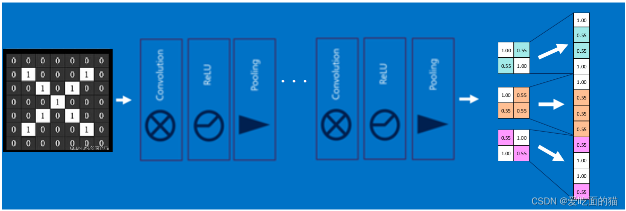 将以上所有结果串起来后,就形成了一个“卷积神经网络”(CNN)结构,如下图所示: