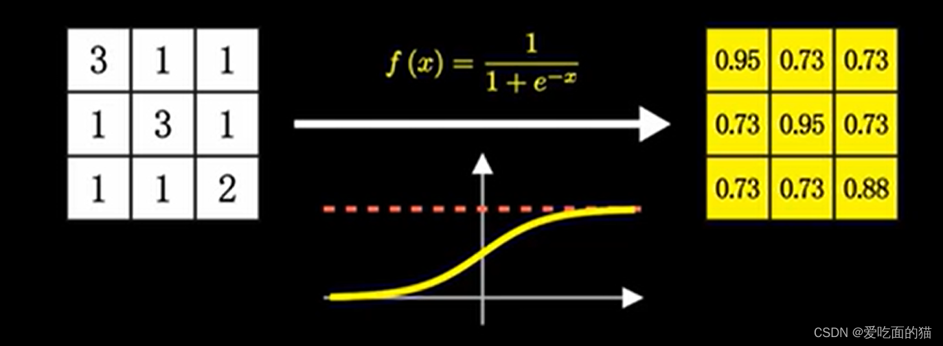 此时需要对池化后的特征图结果使用的是Sigmod函数进行激活,于是就将池化后的特征图转换为0-1之间的数据。