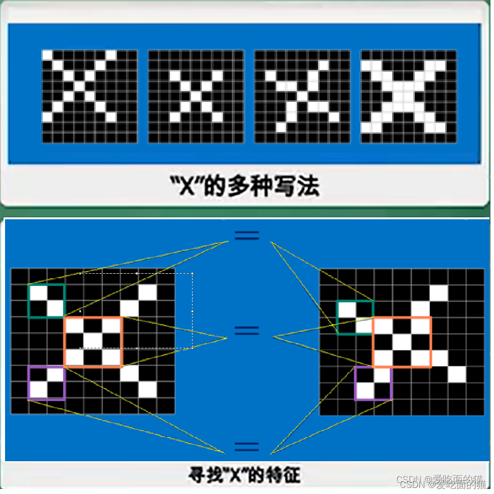 比如我们有1图片,我们想判断一下这幅图片是不是x,但是实际生活中每个人写字不同,X有很多种写法如下图,但是不管是哪一种写法,他们都有一个共同的特征,比如说都有有一个叉,都有1个往左下的线,有1个往右下的线。越符合这些特征,那么这个图就越有可能是X。因此判断这些图像X就需要提取出这些特征。所以卷积的作用就是用一种数学的方法,能提取出这个图像中我们刚刚说的这些特征。
