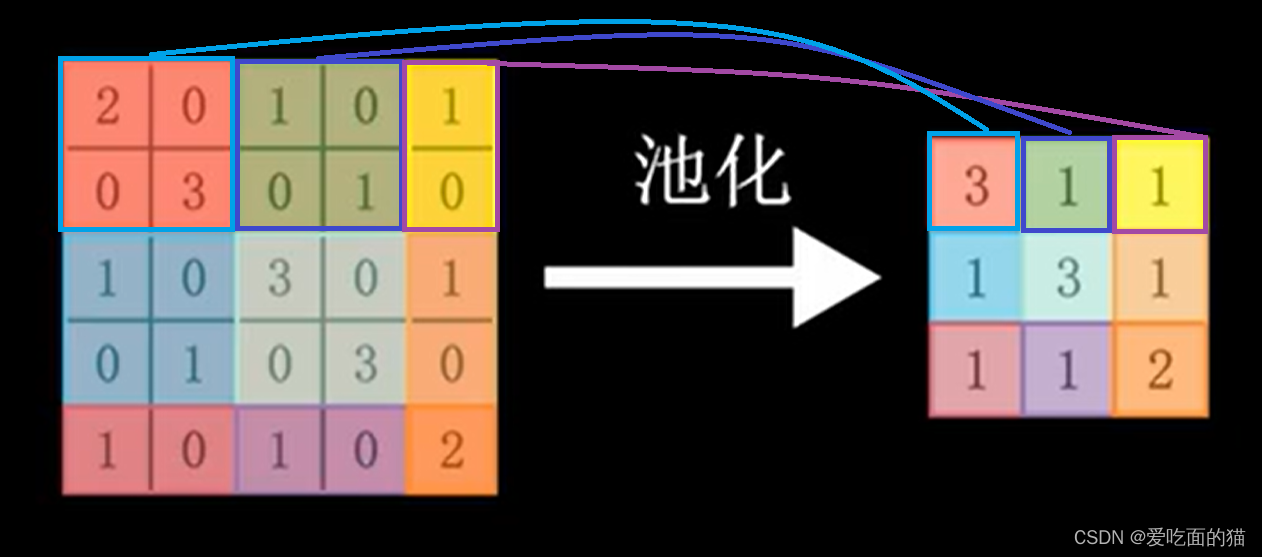 并且经过卷积后的特征图可能还是比较大,不方便计算,则可以按区域对特征图进行提取,选取区区域中最大值,这个值一般也代表原图中的特征,如下图所示,对第一个区域取最大值为3(代表原图中的特征),第二个区域最大值为1,第三区域最大值为1,以此类推。得到池化后特征图结果。