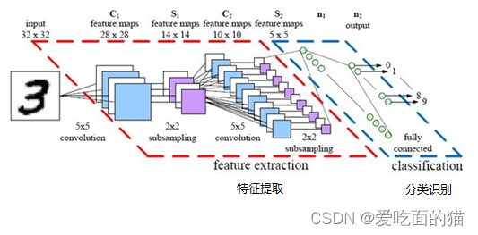 总结:卷积神经网络主要由两部分组成,下图便是著名的手写文字识别卷积神经网络结构图