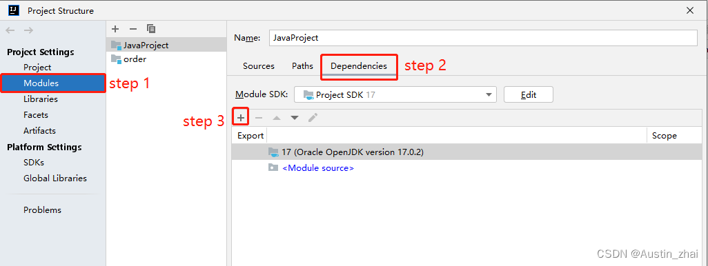 然后依次选择Modules选项,在右侧点击Dependenies选项卡,最后点击下面的加号