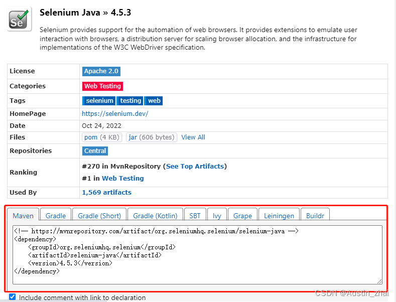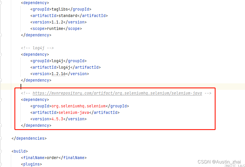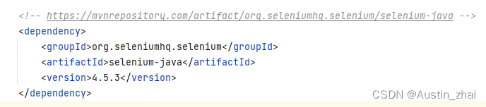 将内容复制到项目的pom.xml中,这里要注意内容需要放在dependencies标签对内。复制后会发现selenium的标签对里的内容为红色,此时因为还没有通过地址下载完对应的jar包到项目内,所以代码会对应的报错。