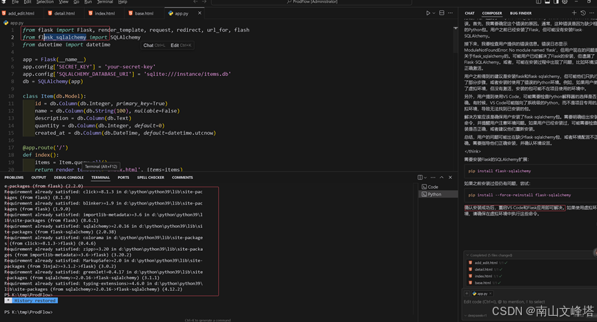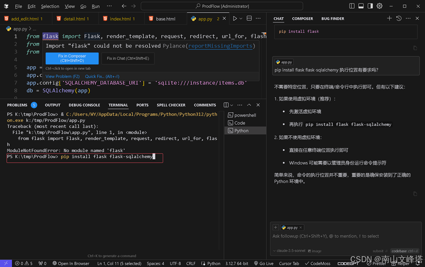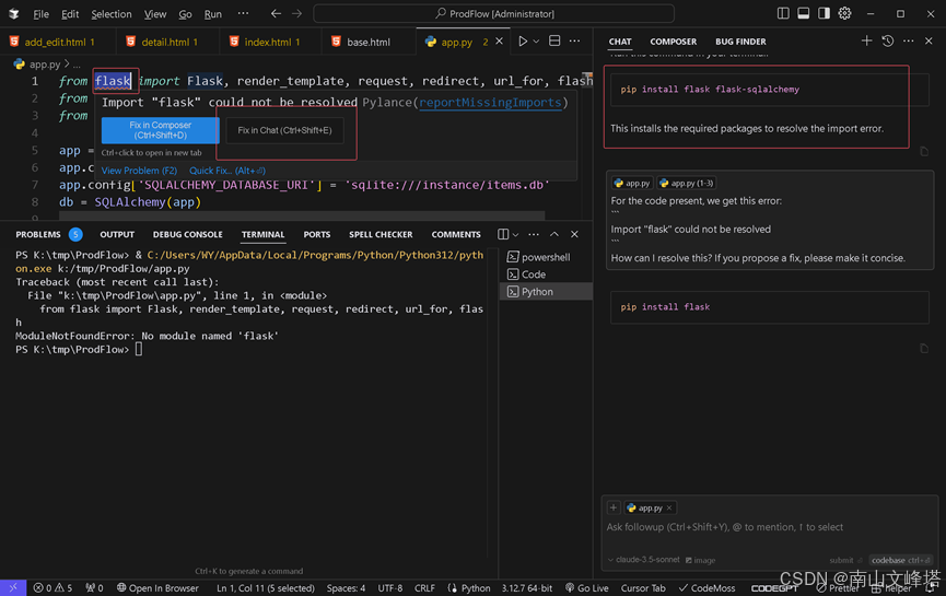 发现在错误,鼠标放上去就会有一个提示,看是补代码,还是补依赖,这是个python项目,有依赖需要安装。按右边的提示复制到