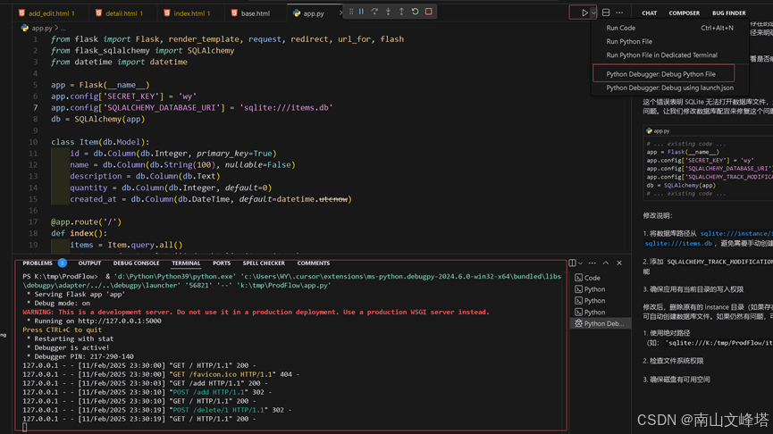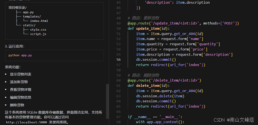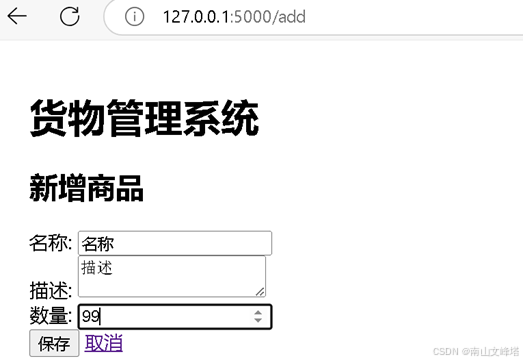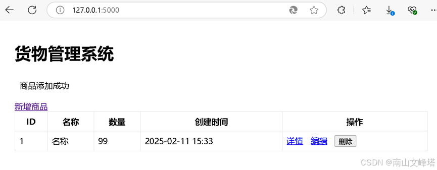 使用python + flask 实现一个货物管理系统,打开页面是货物列表,页面中功能包括查询货物详情,新增货物、删除货物、修改货物信息。