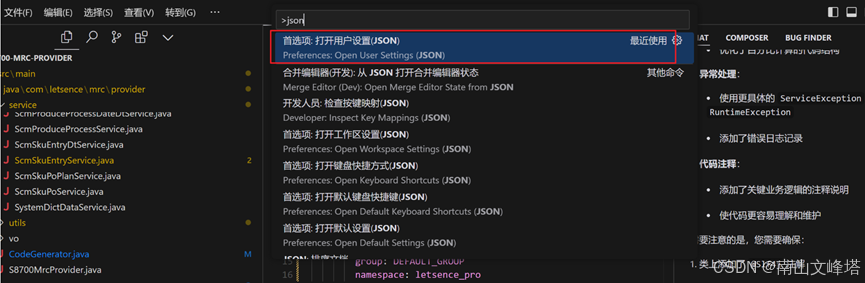 ctrl+shift+p 打开输入框后输入json,打开用户设置