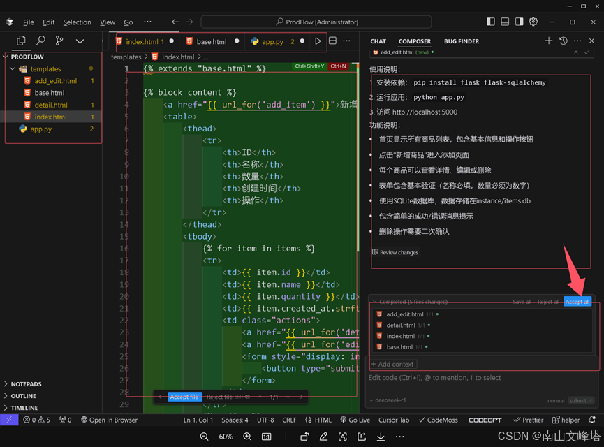 点击Accept接受AI生成的代码,也可以跟AI继续沟通进行调整