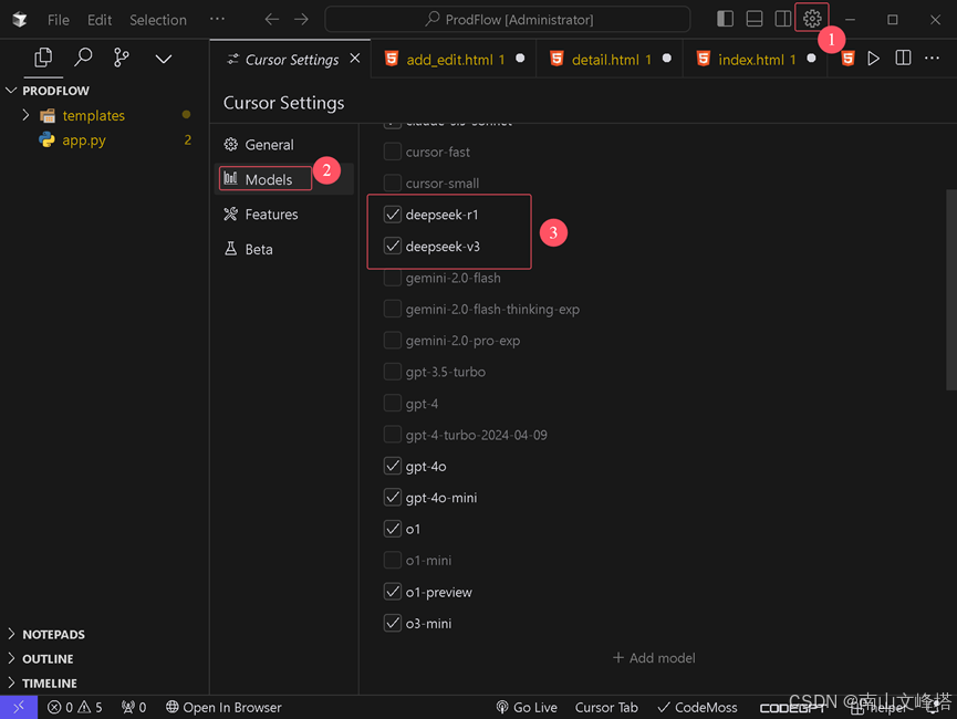本文只是以最新DeepSeek为例,其实Cursor可以使用很模型,只是点最低下模型切换,如OpenAI,Claude-3.5-sonnet