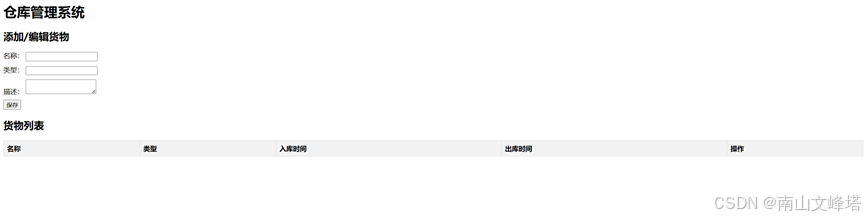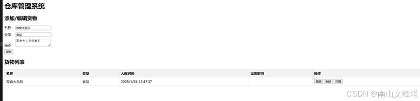 2. 同时页面包含新增货物、查询货物、删除货物、修改货物、货物详情查询。