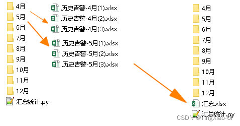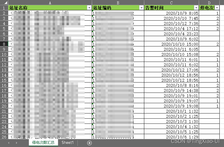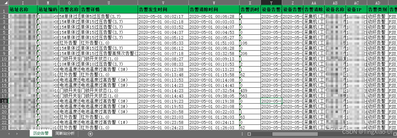 场景:有一批站点,我们从系统导出这批站点的每一个月的信息表,如下图所示,我们想分析这批站点本年度的运行情况,但是表格太多且信息分散,如何汇总?可以人工一个一个操作表格,这个过程是重复、枯燥的过程,且有可能有遗漏,这时候就可以使用程序来代替人工处理了。实现效果:每个原始表格信息如下所示:例如:我们对所有原始多个表提取站点告警以及停电信息,统计汇总输出到一个表内,汇总表如下所示代码如下:#!user/
