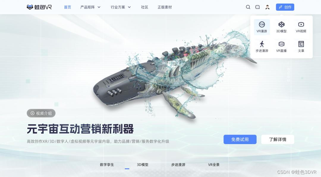蛙色3DVR,支持为各行业的3D数字化内容、VR全景、三维建模等内容提供从0到1的一站式服务,帮助展现行业优势。