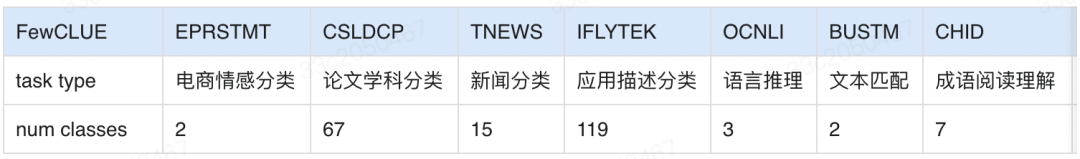 FewCLUE 榜单任务包括文本分类、句间关系和阅读理解三类任务,各个任务中的每个标签分别有25~80条标注数据用于训练,同时有等量的数据用于模型评估选择。除了指代消解任务,其他数据集中还提供了大量的无标注数据。