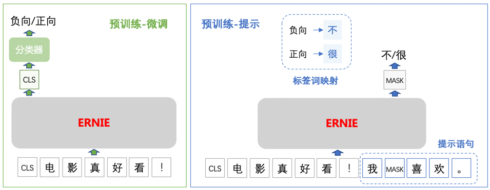 预训练模型学习知识和模式的能力已得到了充分的验证,提示学习(Prompt Learning)的主要思想是在不显著改变预训练模型结构的前提下,通过给输入提供“提示信息”,将下游任务转化为完形填空或者文本生成任务,充分挖掘预训练模型学到的知识。具体来讲,在“预训练-微调”范式中,预训练模型仅用于文本编码,实现下游分类任务需要额外训练一个分类器。而 PET 这类提示学习方法,从预训练模型的输出就可以直接映射得到预测标签,无需训练额外参数。例如,在情感分类任务中,二者区别如下图所示。