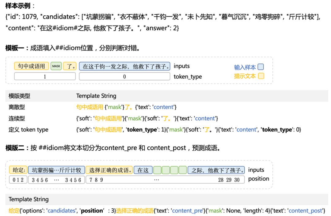FewCLUE 实践中主要使用了 PET 算法[5],对于各个任务,需要分别设计提示词将其转换为掩码预测任务。例如,针对语言推理任务(OCNLI),可以给两段文本增加提示词得到:“慢慢来啊,有人在帮我找了。”和“我安慰别人别着急”之间的逻辑关系是 MASK。如果 MASK 位置预测为“矛盾”,那么对应标签为“contradiction”,同理,“蕴含”对应标签“entailment”,“中立”对应标签“neutral”。针对成语阅读理解任务(CHID),可以将多选填空题拆分为判断题,依次将候选成语填入空格处判断是否合适。提示词设计对结果影响很明显,部分数据集上不同提示词结果可相差10个点,因此,提示词的选择就十分重要。我们使用 AutoPrompt 来高效搜索最优提示词。如下所示,在配置文件中定义多个提示词模板,运行脚本即可得到其中最优提示词对应的模型。