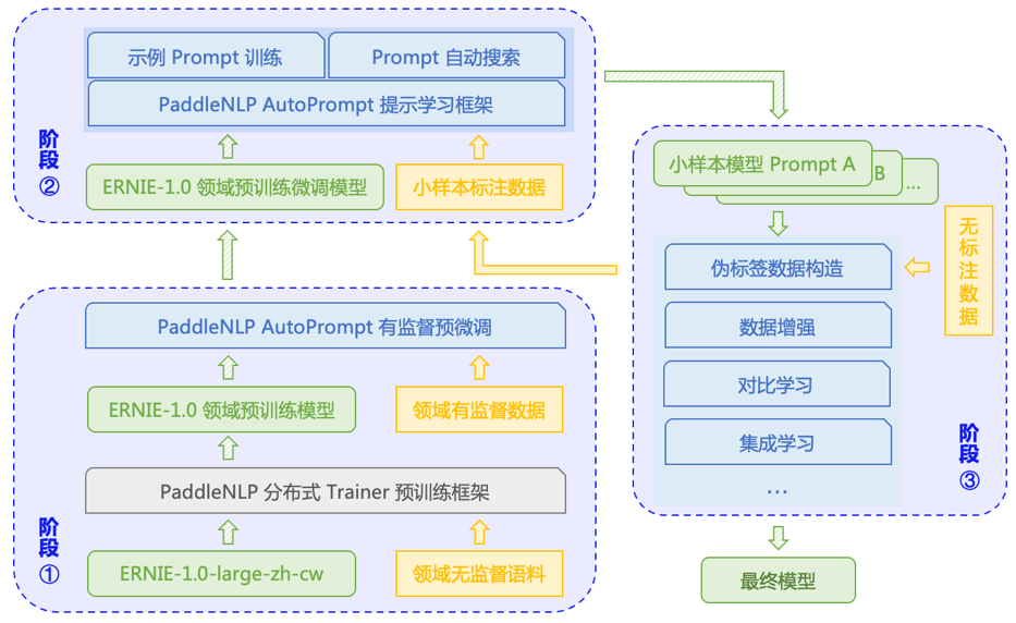 针对 FewCLUE 相关领域收集了无监督数据,使用 PaddleNLP 开源的 ERNIE 预训练流程进行二次预训练,将领域知识进一步强化到预训练模型中。