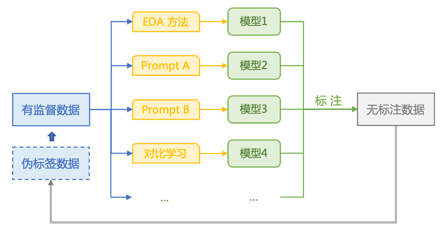 除了预训练模型和算法,数据也是重要的一环。数据增强策略可以扩充标注数据量,增加训练样本的多样性,从而提升模型训练效果。在 FewCLUE 数据集中,除了指代消解数据集 CLUEWSC,每个数据集还有大量无标注数据。我们基于不同提示词及数据增强策略训练得到多组模型,然后使用准确率较高的模型对无标注数据进行预测,投票选择置信度较高的值作为“伪标签”,进一步扩展训练数据,实现模型的迭代优化。在 FewCLUE 实验中,我们只使用了单次迭代。