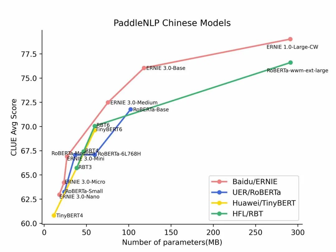 PaddleNLP 致力于建设中文场景的特色模型,并基于中文权威榜单 CLUE Benchmark 对预训练模型做了详细评测。文心 ERNIE 系列模型融合了知识信息,其各量级的模型都取得了非常好的成绩,下面是具体的效果对比。