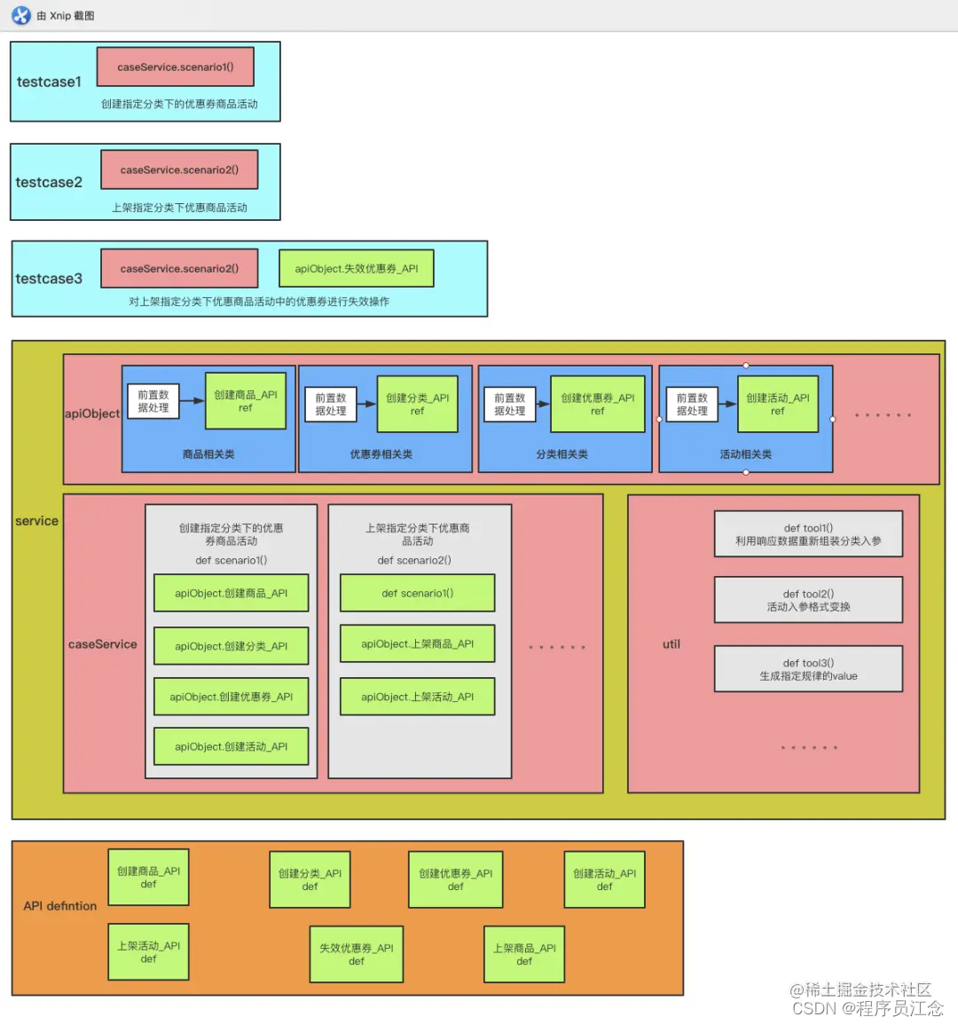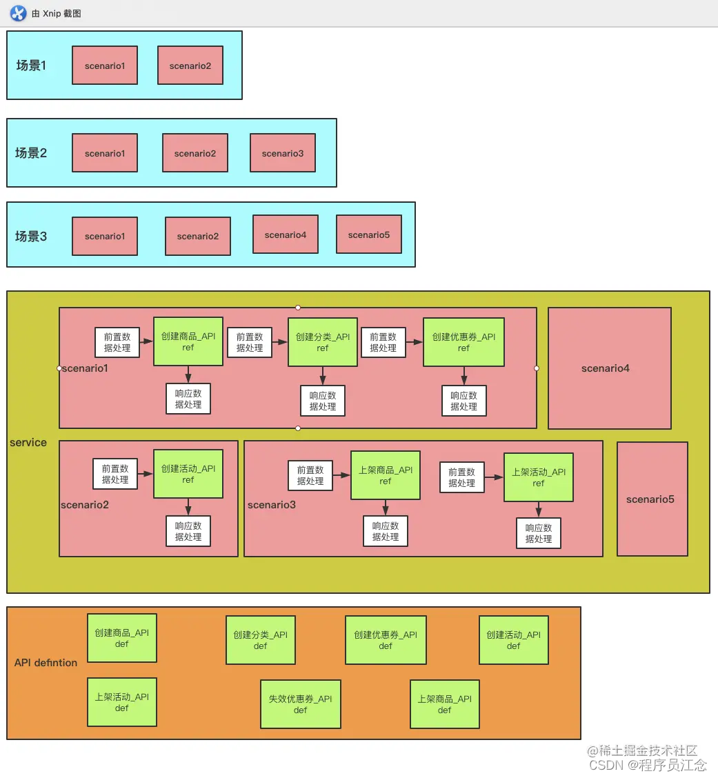 3个场景中都有重复的步骤,类似创建商品、创建分类、创建优惠券这些,并且这些步骤都是一个个API的组合,一个步骤对应一个API,在各个步骤之间还会有数据的处理与传递,为了解决这些问题,将对场景再次做抽离,这里我称之为 service 层。
