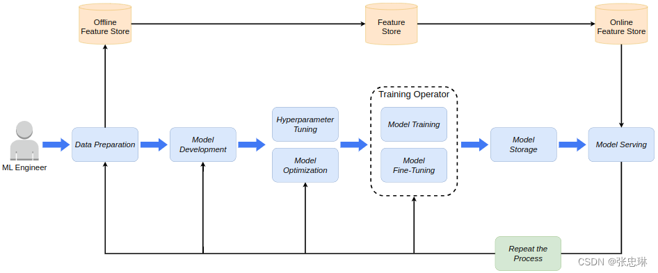 Training Operator解决了AI/ML生命周期中的模型训练和模型微调步骤,如图所示: