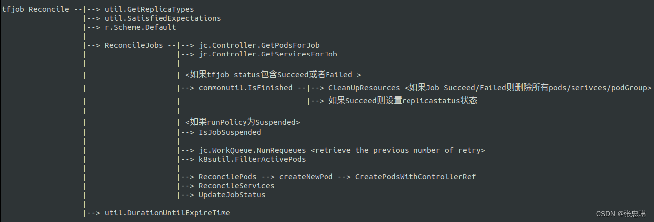 例如TFjob的Reconcile实现,最终要根据定义的spec设置成期待的状态,这里就是最核心的就是调用ReconcileJobs,再分别调用ReconcilePods,ReconcileServices。ReconcilePods这里会生成pod的spec,其中包括环境变量TF_CONFIG,例如: