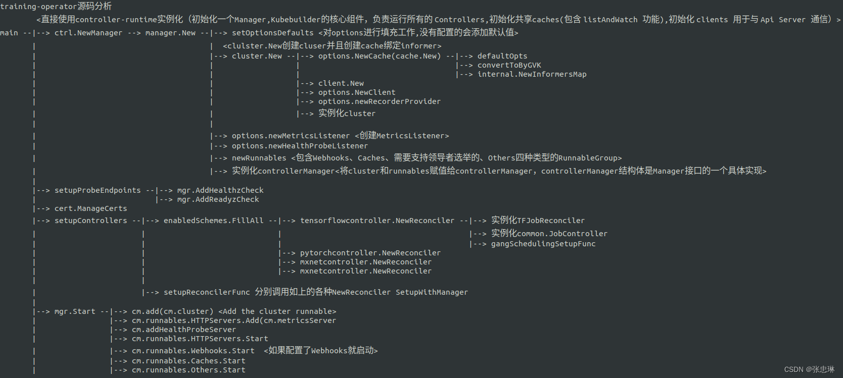 Training Operator启动流程,这里直接使用了kubebuild创建,具体可以参考kubebuild创建项目(Introduction - The Kubebuilder Book),可以了解controller-runtime具体实现,manager controller等。