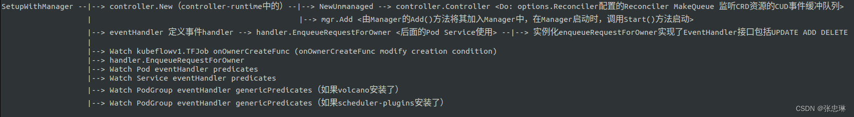 这里分别调TFJobKind PyTorchJobKind MXJobKind XGBoostJobKind MPIJobKind PaddleJobKind 的SetupWithManager创建controller,将各种CRD的Reconcile添加到Controller中,这样当workqueue中存在事件时,会交由Reconcile处理。