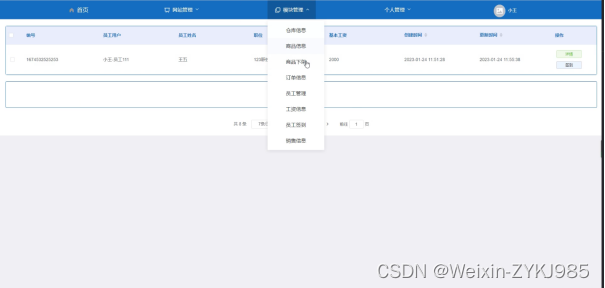 员工登录进入数字化超市管理系统可以对首页、首页、仓库信息、商品信息、商品下架、订单信息、员工管理、工资信息、员工签到、销售信息、个人管理等进行相应的操作管理,如图5-6所示。