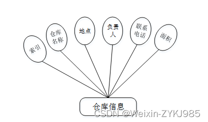仓库信息管理实体属性主要包括索引、仓库名称、地点、负责人、联系电话、面积等属性。仓库信息管理实体属性图如图4-6所示。