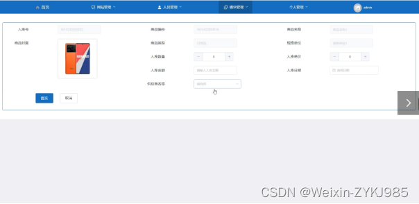 入库管理,在入库管理页面中可以对索引、商品编号、商品名称、入库数量、供应名称、入库单价等信息进行详情、修改或删除等操作,如图5-5所示。