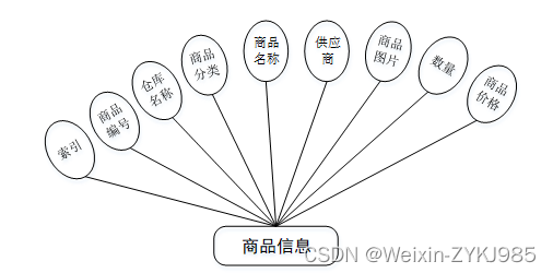 商品信息管理主要包括索引、商品编号、仓库名称、商品分类、商品名称、供应商、商品图片、数量、商品价格等属性,商品信息管理属性图如图4-5所示。