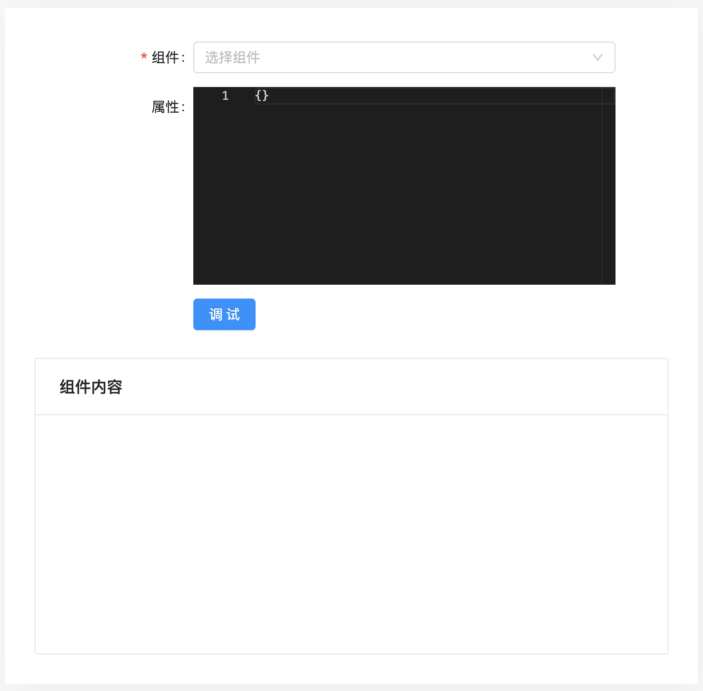 为了便于调试,预留了测试组件的页面,在下拉框中选择相应的组件,并填写完属性后,就会在组件内容区域呈现效果。