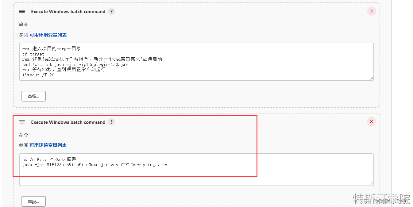 增加Execute Windows batch command构建步骤,在其中编写bat命令脚本完成项目jar包的启动.