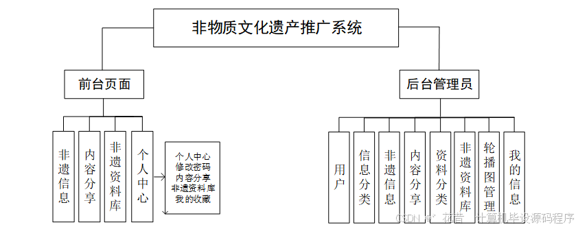 本课题要求实现优质的非物质文化遗产推广系统,就一定要包含数据库和服务器相联系,从而实现系统的功能运转。系统分为用户模块和管理员模块两部分,