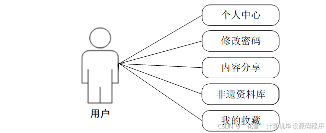 用户:用户进入系统可以实现对个人中心、修改密码、内容分享、非遗资料库、我的收藏等功能进行操作,用户用例如图3-2所示。